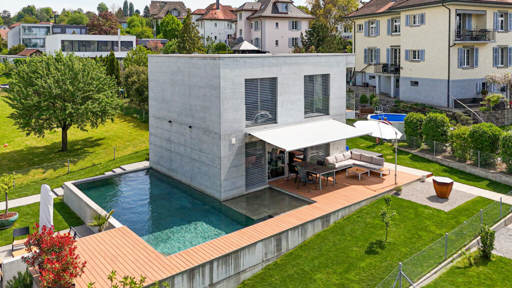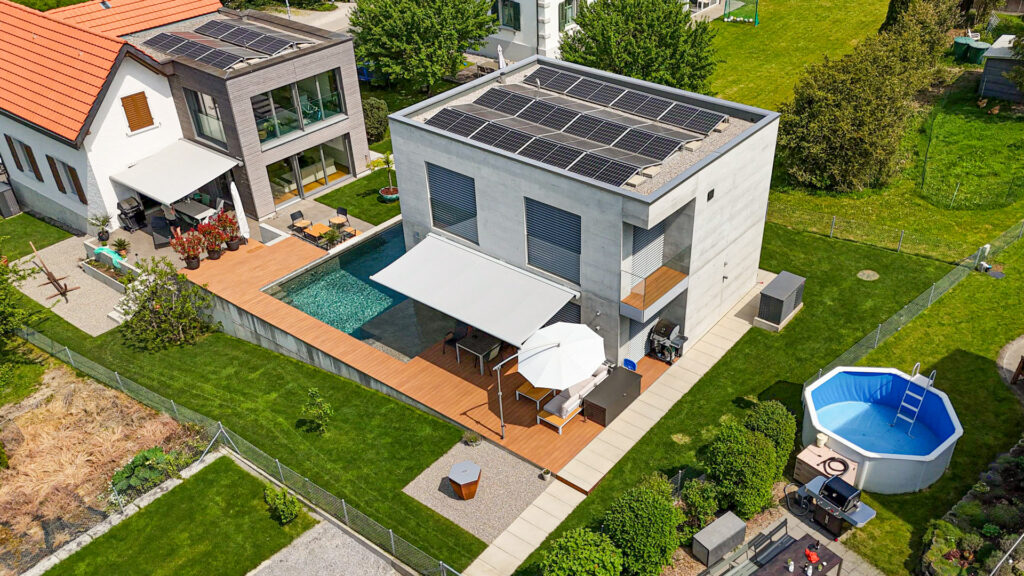 Anbau Poolhaus an bestehendes Einfamilienhaus mit zentraler PV-Anlage. Steuerung über Loxone: Automatische Beschattung, Zutritt & Alarm, Lüftung, Kühlung, Heizung, Lichtsteuerung sowie Spezialfunktionen.