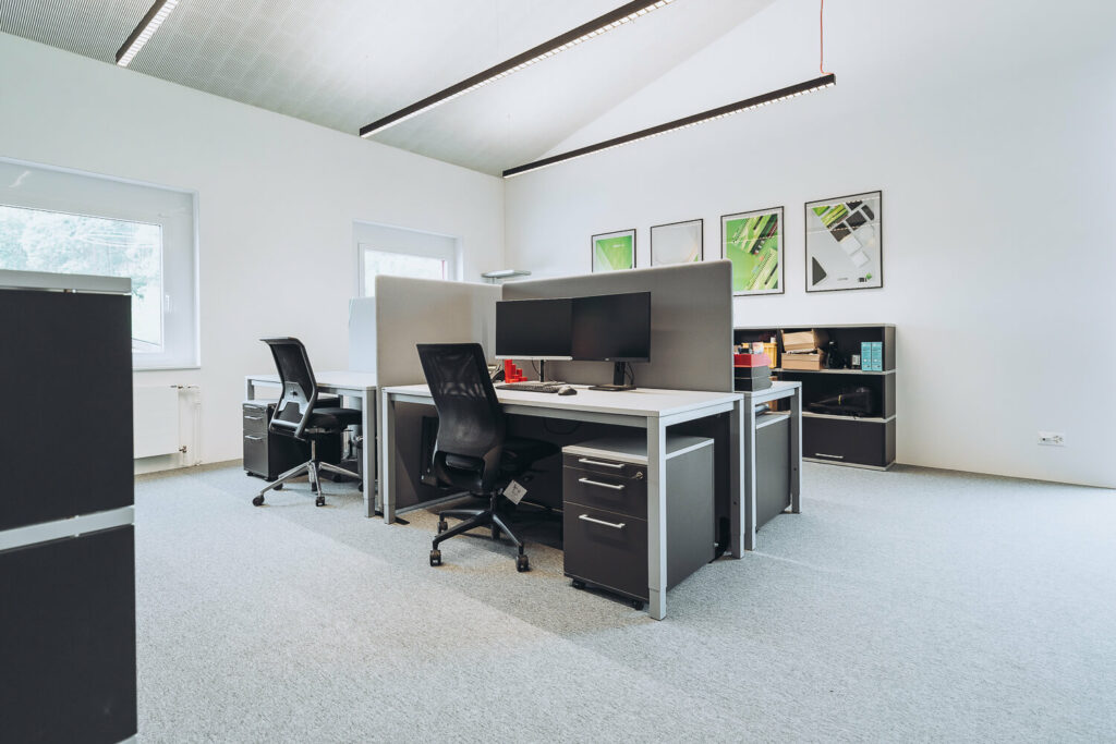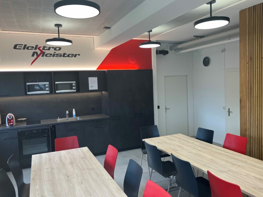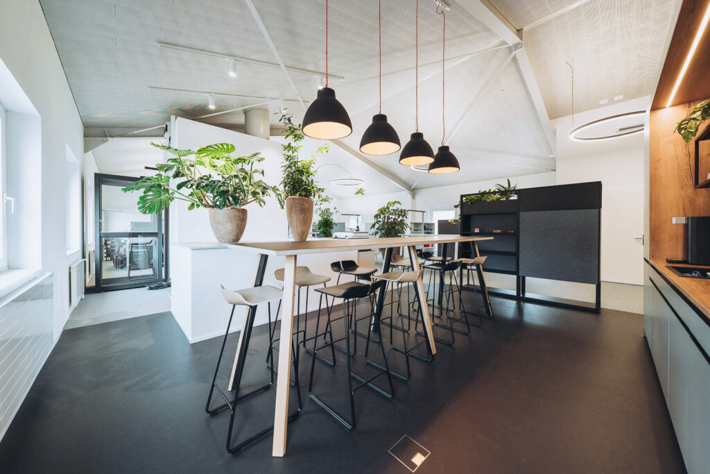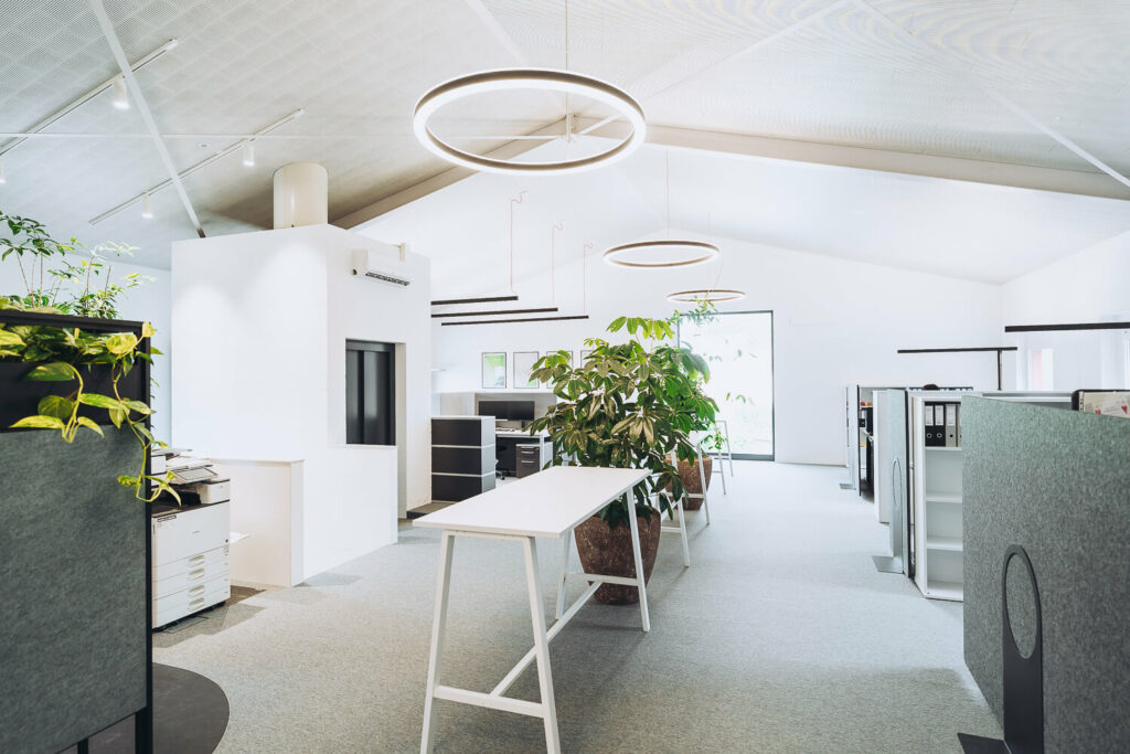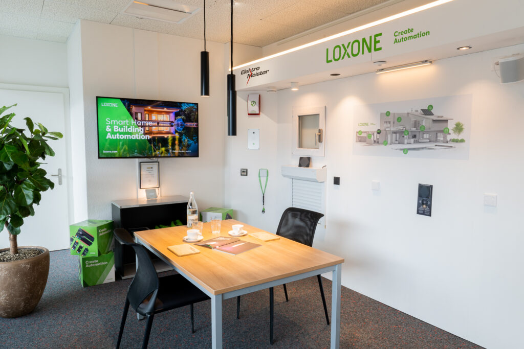 Die Lösung lag bei Loxone mit allen Vorteilen der intelligenten Gebäudetechnik. Das Office sowie die Werkstatt mit Garagen kommen nahezu ohne Schalter aus. Eine Tageslicht Regelung sowie die Anwesenheit Erkennung sparen Energie und sorgen immer für die idealen Lichtverhältnisse. Ein wesentlicher Aspekt ist die Heizungsregelung, die nur zu den Öffnungszeiten im Komfortmodus betrieben wird und am Wochenende ganz absenkt. Die Automatikbeschattung sorgt im Sommer in Verbindung mit der Klimaanlage für ein perfektes Raumklima und wird mit dem Co2 Fühler im gesamten Gebäude überwacht. Dank der Photovoltaik Anlage kann über den Miniserver an mehreren Ladepunkten intelligent geladen werden und so die Energie bestmöglich verteilen. Für den dezenten Hintergrund Sound sorgt im Office sowie im Aufenthaltsraum der Loxone Audioserver der im Notfall auch wichtige Durchsagen generiert sowie in der Alarmanlage integriert ist.