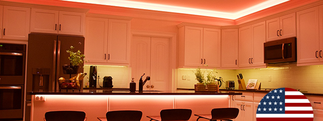 Let’s take a look at our ambient lighting in our newest Showhome in Media, PA. In rooms like the kitchen, living room, dining room and bedroom, we use RGBW LED strips in addition to our LED Spots, so that we can create unique color accents. As you’ve seen from the pictures above – it looks awesome!