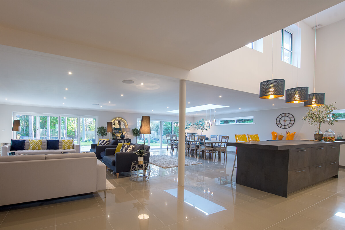 The main smart home feature in this home is evident in the large day space area – an immense open plan area on the ground floor, leading off the entrance hall through double doors ahead of you. There you’ll find the entertaining heart of the home. A beautifully arranged seating area with a side-by-side fireplace and flat screen TV adorning a feature wall; a 12-seater dining table and drinks sideboard; flanked by a double volume kitchen with solid clean lines, and a robust island with three modern metallic cut-out patterned pendant lights hanging above.