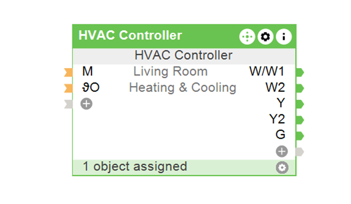 With this new Function Block, you can control various HVAC (Heating, Ventilation and Air Conditioning) systems. This block is optimised for use with the Intelligent Room Controller to manage the heating or cooling source and its intelligent mode switching.
