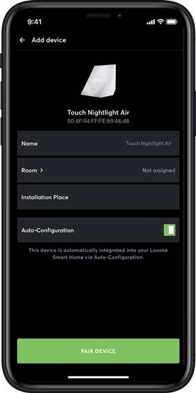 With the latest version of Loxone Config and our app, Loxone Air devices can be searched for and paired directly via the app. The auto-configuration for the paired device can also be triggered directly via the app. The product is then immediately ready for use. This saves a lot of time when commissioning Air devices. The Loxone Touch Nightlight Airl, for example, can be put into operation in just a few moments.