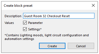 These compatible Function Blocks now have a new input (RtD) via which the “default template” can be restored. You can then create your own separate logic to trigger the input. This feature is particularly useful, for example, if you want to reset certain lighting moods, music favourites*, ventilation settings, alarm clocks and schedules to default values.