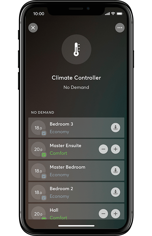 This view in the app will show, at a glance, which rooms are being heated or cooled, and the current state of the relevant source.