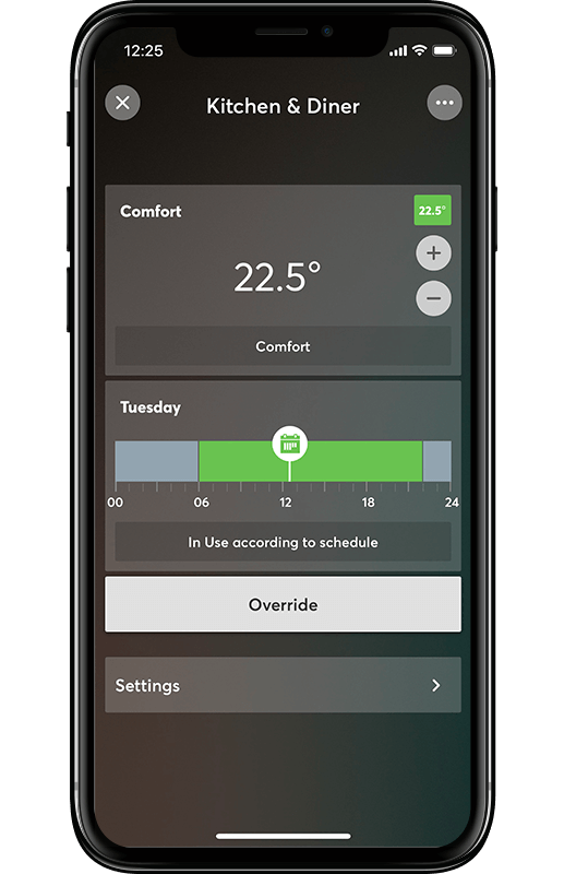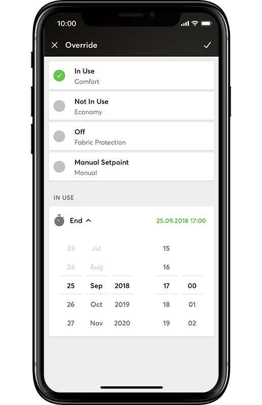 Nothing goes completely to plan. So, if your customer finds themselves wanting to heat a room outside of the normal schedule or that they won’t be at home for a specific evening, then they can simply select an override. This intuitive view gives your customer the option to select how long to deviate from the schedule and what action the home should take.