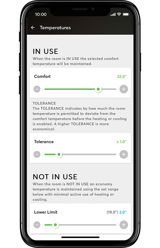 In addition, Real Smart Home owners can also define a tolerance. This is how much the room temperature is allowed to deviate from the desired temperature before either the heating or cooling kicks in. A tolerance of +/- 0.5 and +/- 3°C can be selected using a convenient slider.*