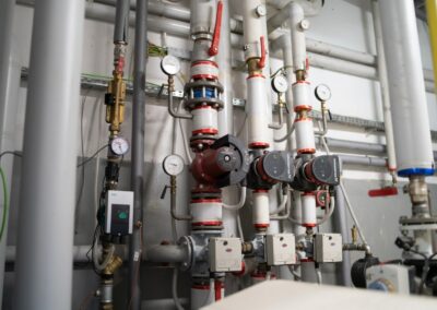 There are several heat sources in the shopping centre. The primary ones among these are two gas-fired cogeneration plants (with an output of 50 kW and 30 kW), which, when fed with gas, convert it into electricity and heat. In addition, in the boiler room, there is a cascade of gas boilers and a cascade of heat pumps. The total installed capacity of the system significantly exceeds the needs of the facility. However, this was intentional by the owner, who wants to remain independent of the energy price fluctuations.