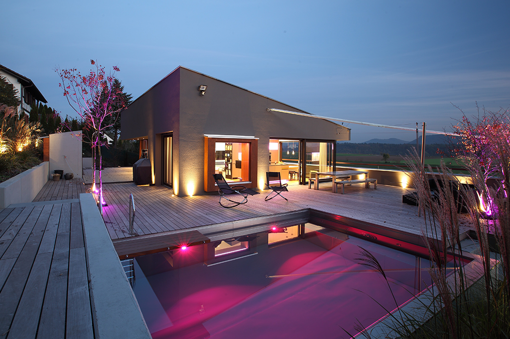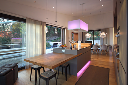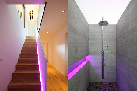 Beside the staircase, behind the headboard, along the cabinets, in the outdoor area – colour LED strip and colour LED spots ensure the perfect lighting mood is created for any occasion (and often creating jealous visitors).