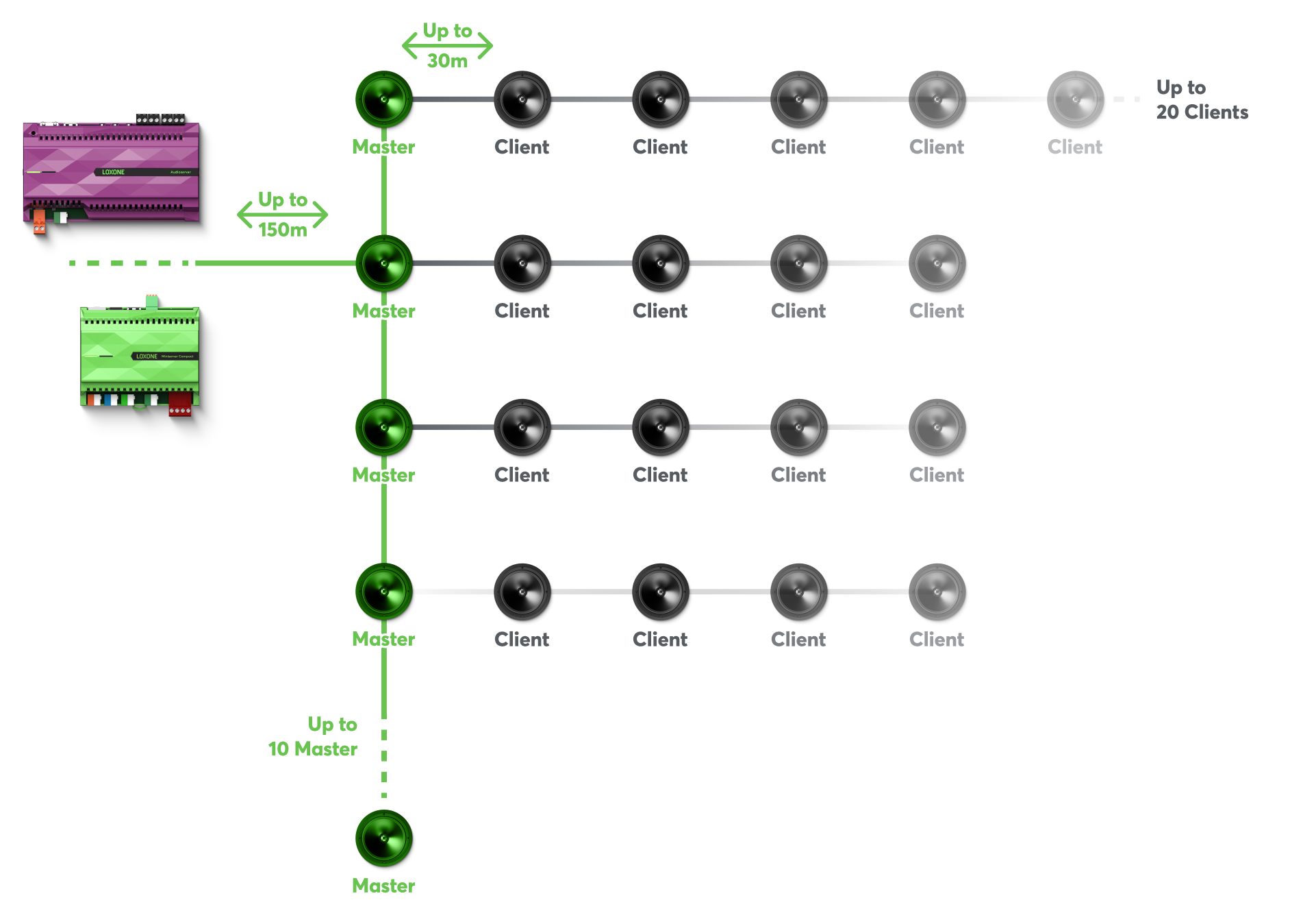 The innovative Master/Client technology reduces the cabling effort by more than 80% and enables flexible expansion and customised scaling of your audio installation. The Master speaker sets the pace, while the clients can be individually adjusted in volume.