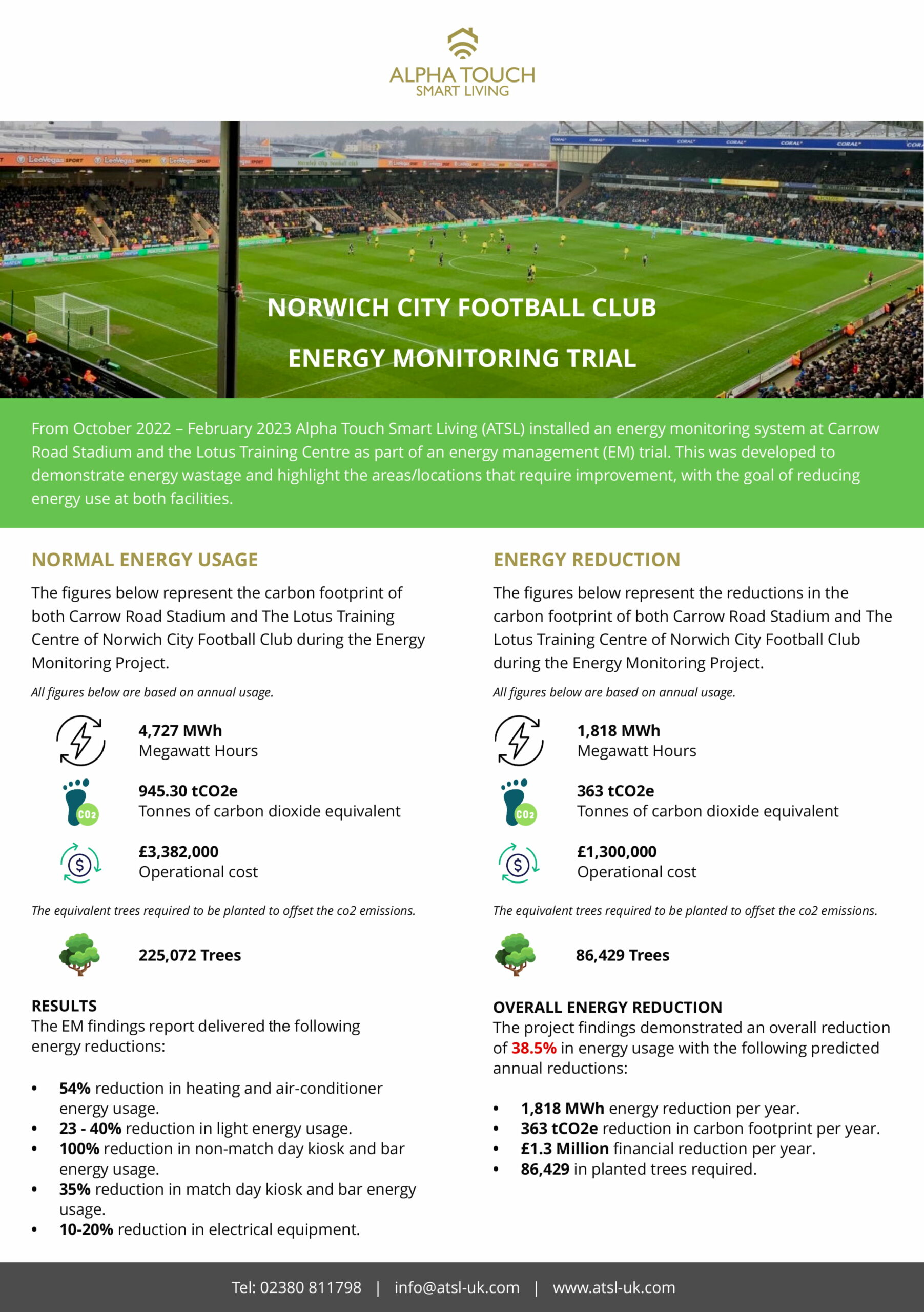We bring to you some revolutionary data, from ATSL (Alpha Touch Smart Living), in the area of large scale energy management – precisely the energy management of a football stadium. The ATSL team conducted an energy audit for Norwich City FC to uncover how and where Loxone automation would save them energy, and ultimately money, by reducing their usage. With this project starting a snowball effect for thought leaders in the industry, due to the big energy savings being recorded and fast ROI’s.