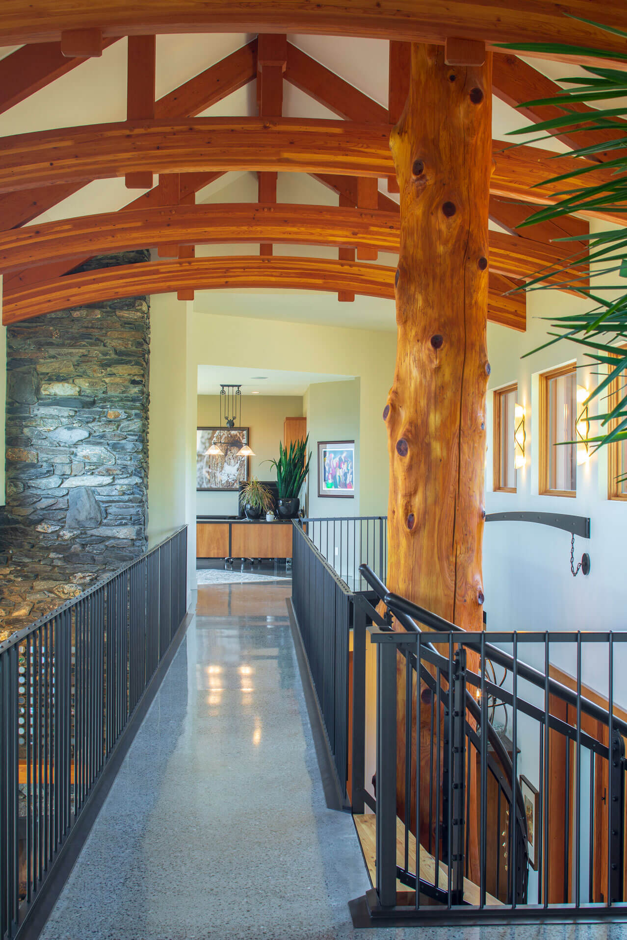 Once a fallen tree found by the homeowners on the Victoria island, a reclaimed 37-foot-tall red cedar tree is now a centerpiece of the home, bringing inside even more of the outdoors. Surrounding the tree is a mixture of lighting fixtures, all controlled by a Loxone DMX Extension, with smooth dimming that feels just as natural.