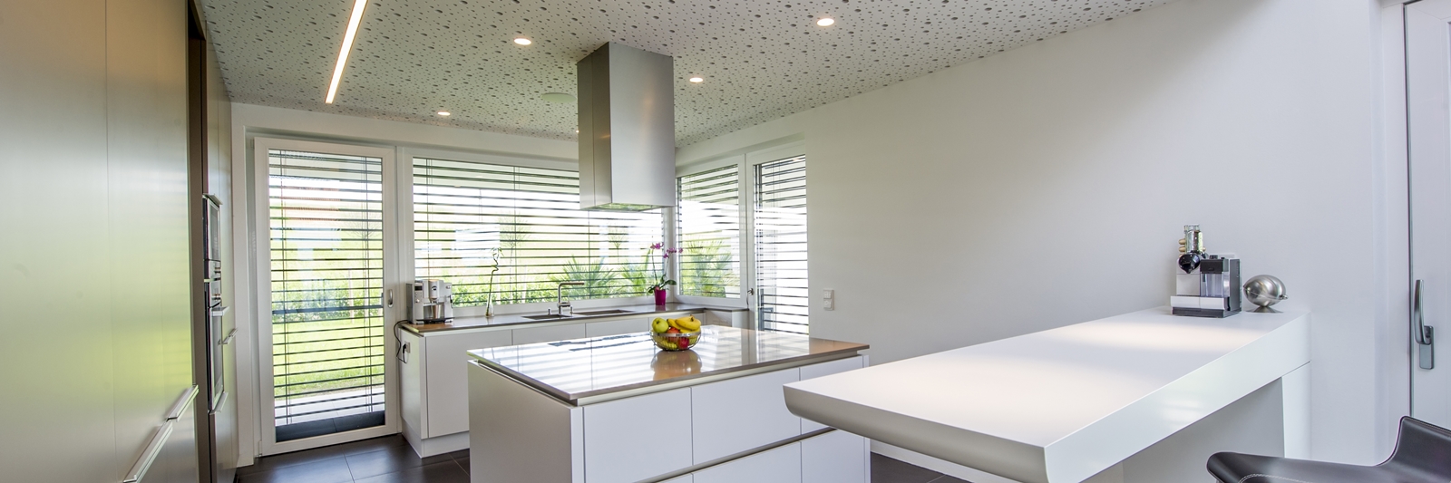 The skylights in White N have two basic functions – to let in sunlight and to aerate the living area. The hard to reach windows are of course fully automatic. In ventilation mode, the slats of the blinds are positioned horizontally, so that a cool breeze can filter through whilst keeping the sun out. At excessively high wind speeds, the blinds are automatically retracted into the safety position.