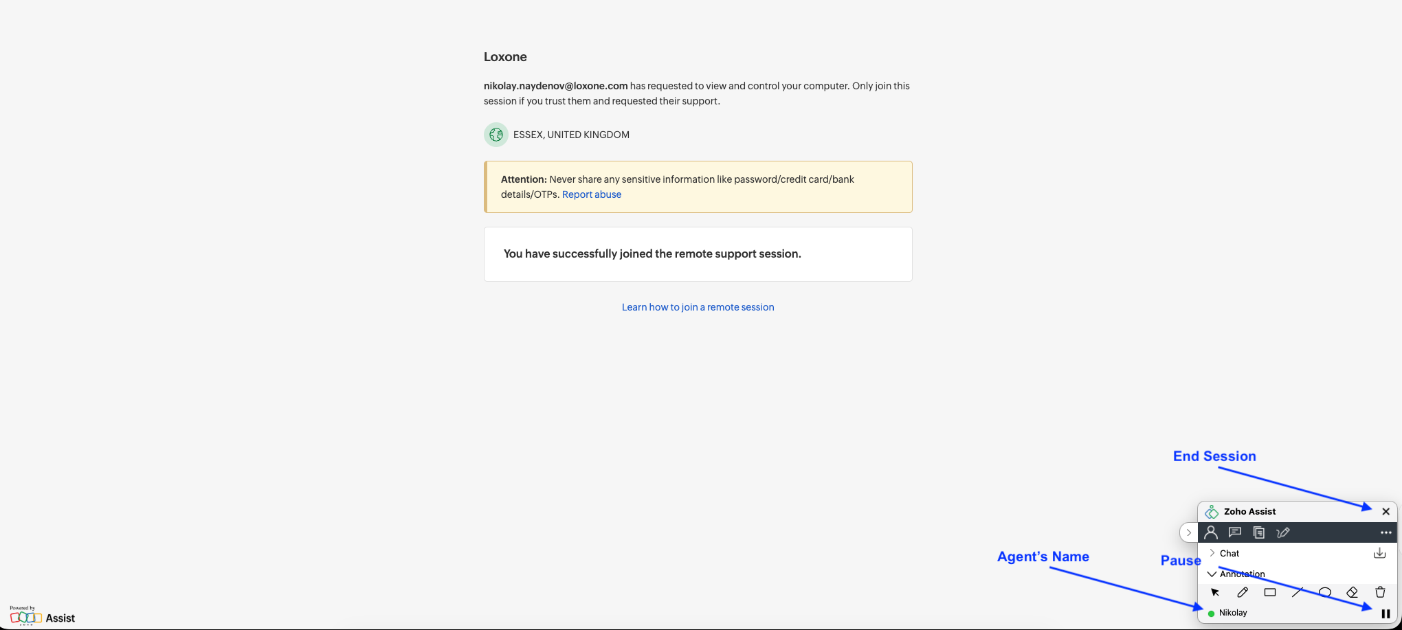 You can see that your session is active and the name of the Loxonaut in the window in the bottom right-hand corner. From here, you can also click the pause icon to pause your screenshare, or click the X to end the session