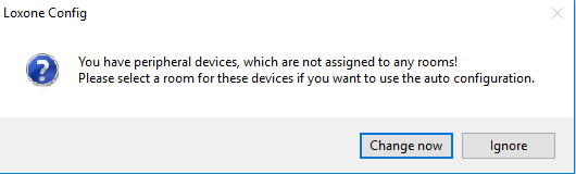 If any of your Loxone devices are missing room or category information, you will be notified. You can either choose to ignore this or click ‘Change now’ to cycle through each device with missing details