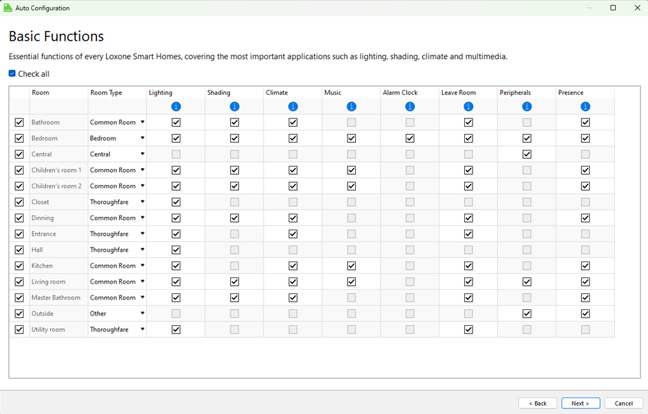 Once you have addressed any missing information, you will presented with Basic Functions. This dialogue will allow you to pick which rooms get auto configured, and which functionality you want to be configured for said room. If Auto Config cannot find a suitable item for that feature, it will simply not provide a tick box, but a dash instead.