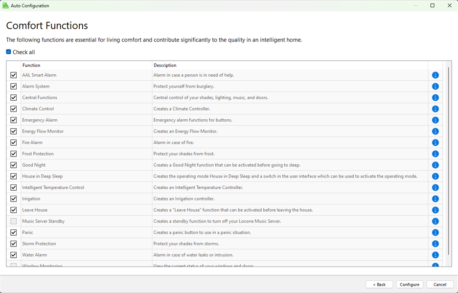 After selecting the features you want Auto Config to use, you can proceed to the Comfort Functions dialog. This allows you to further customize the functionality for automatic configuration. These are advanced features that enhance the base functionality of the Loxone System. For more information on each function, simply hover over the blue ‘i’.”
