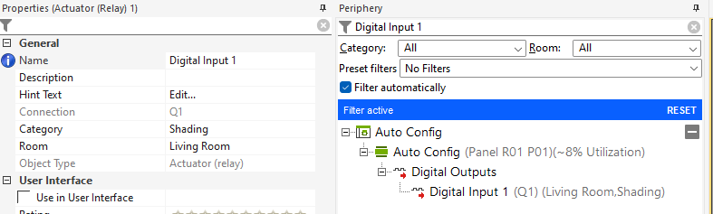 Settings for digital/analog outputs: Room & Category are mandatory to fill in so that Auto Config knows how to configure it. For example Shading.