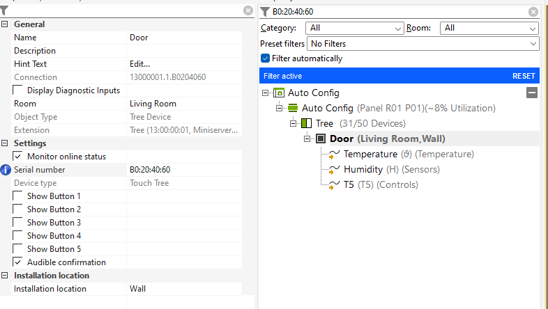 To ensure the Auto Configuration tool functions reliably, you must assign names to all peripherals and correctly allocate them to the appropriate rooms and categories. This applies not only to Tree and Air components but also to digital and analog inputs and outputs. To customize these settings, select the relevant peripheral and navigate to the General settingsĀ tab. There, you will find the Room and Category fields.
