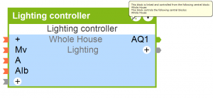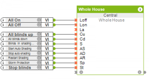 In the central block you can see all the lighting controllers and automatic blinds in the program and choose whether to use them as inputs or control them from the central block.