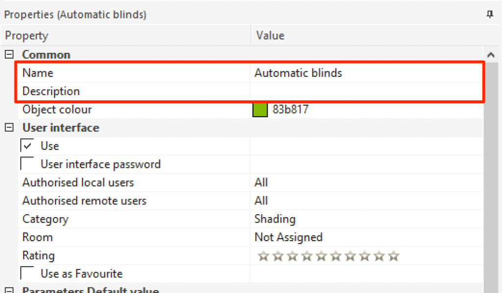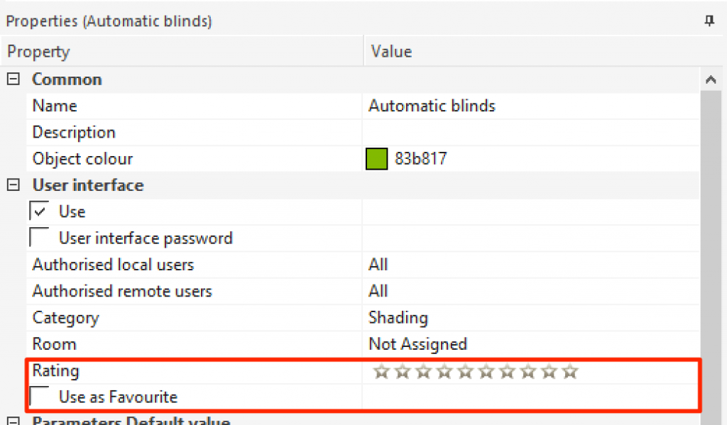 In the ‘User Interface’ section of the properties window, you can also assign a 0-10 star rating. This rating determines the order in which objects are shown on the home screen of the user interface.
