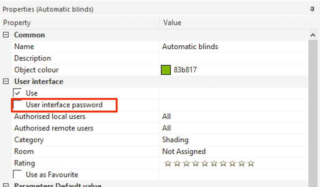 You can also use the user passwords on specific blocks to make the user interface even more secure. For each user a password can be set. Simply select the required user on the Periphery tree and give it a password in the Properties section under “User interface password”.