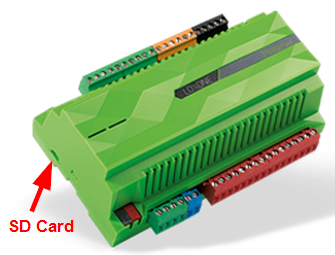 This behaviour indicates that the Miniserver does not recognise the SD card. Please check whether the SD card is inserted correctly into the slot on the lower left hand side of the Miniserver as depicted below.