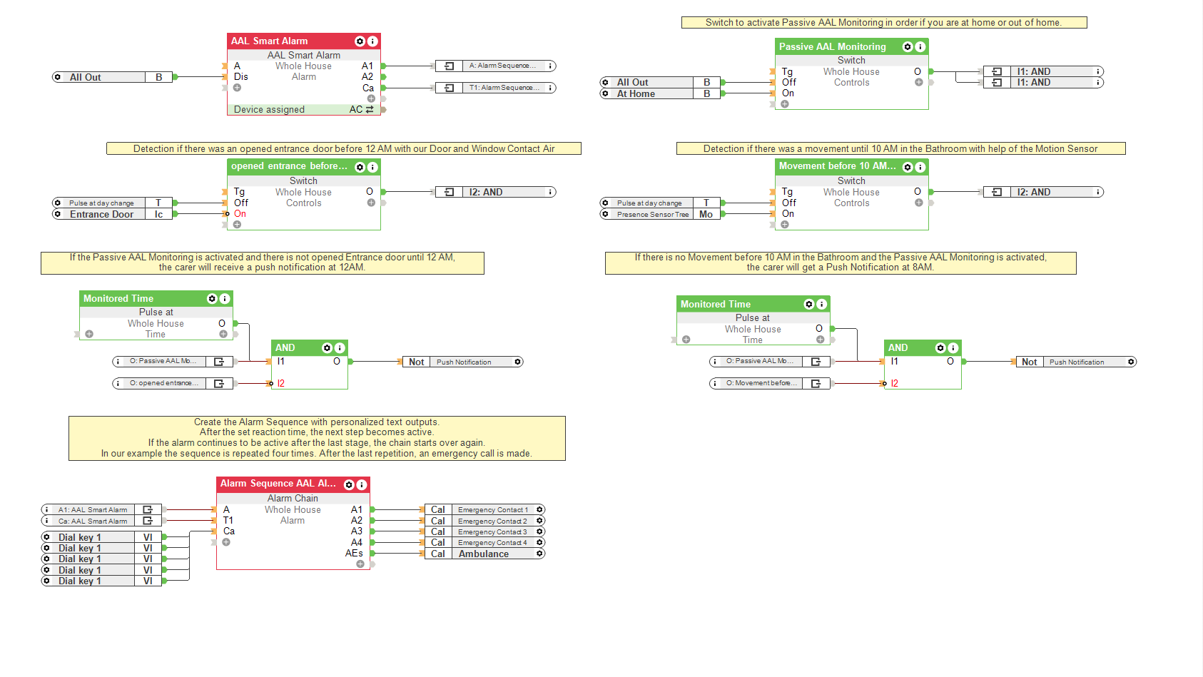 An extra option that can be useful is the integration of the Loxone Caller Service, this is in addition to the push notifications, whereby the carer will also receive a telephone call. Again, multiple phone numbers can be linked to an alert for specific actions.