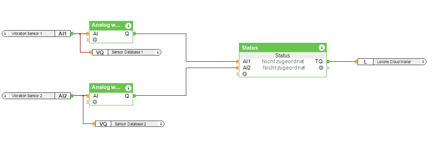 Sensors record the vibration data of machines, specific parts, etc. and thus provide information about the wear and tear and the stress on the machine. The data collected by the vibration sensors are evaluated by the Miniserver and visualized in real-time.