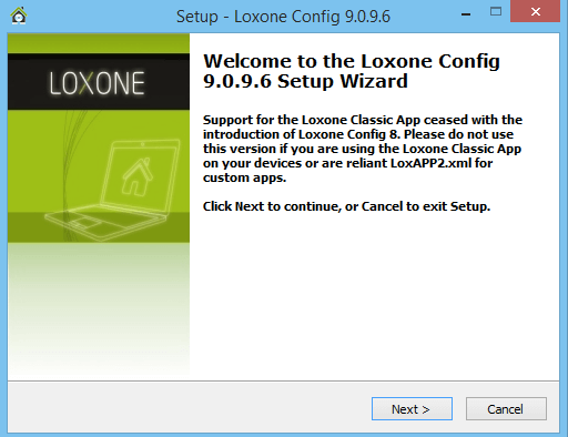 Download the Loxone Config Preview and open it from your downloads folder. When installing the new preview version the first screen of the setup wizard looks like this, simply click “next”.