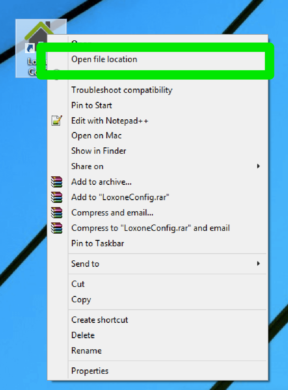 After completing the installation find the “Loxone Config” shortcut on the desktop from the previous version, in our case 8.3 here. Right click this icon and select “Open File Location”.