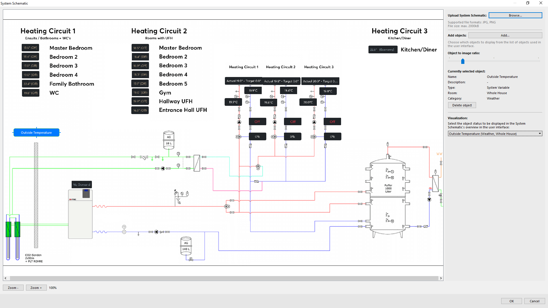 A schematic diagram will help create a simple visual representation of a complex system. To achieve this with Loxone we’ll use the “System Schematic” Function Block. Simply upload an image of the system, then Function Blocks can be overlaid onto that image to give a clear overview. In our example, we’ve got a heating system with heating circuits. The pumps, the manifolds, the mixing valves, as well as the flow and return temperatures are displayed graphically.