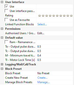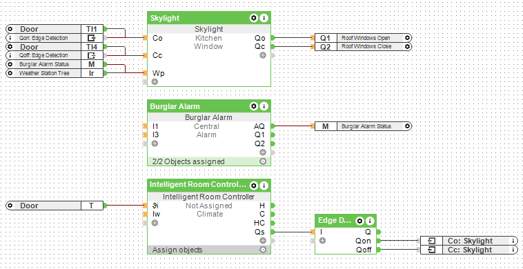 Please be aware that, by default, the Skylight block outputs 5s long pulses on “Qo” and “Qc”. However, the Velux hardware requires an input pulse shorter than 1s in order to fully open or fully close the window. As such, ensure you adjust the “To” and “Tc” parameters accordingly:
