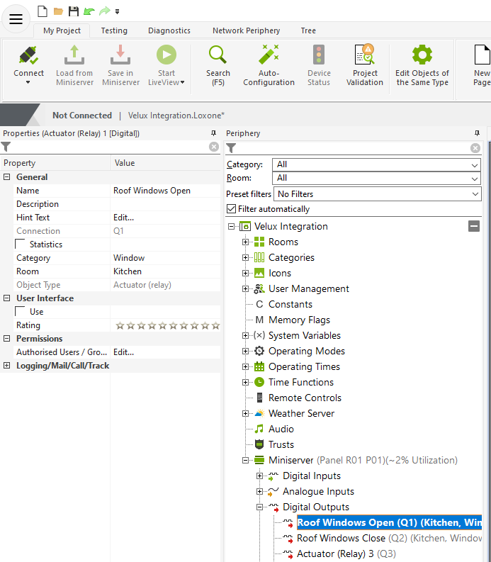 As described earlier, integrating your Velux roof windows into Loxone can give a range of other benefits. In this example, we’re using the shading output of the Intelligent Room Controller – “Qs” – to trigger the roof windows to open if the temperature in the room rises above the shading setpoint, and to close when the temperature falls back down again. We’re also forcing the windows to close whenever it rains (as detected by a Weather Station Tree) or when the burglar alarm is armed. The “Wp” input on the Skylight block ensures that, once they are closed, nothing else other than manual interaction with the app can open them.