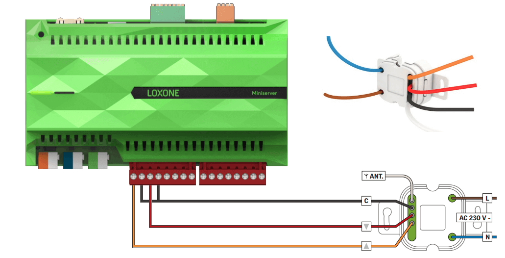 Connect the common wire(s) to one contact of both relays, and then the “up” wire to the other contact of relay 1, and the “down” wire to the other contact of relay 2. An example of how to do this with a Miniserver is shown below: