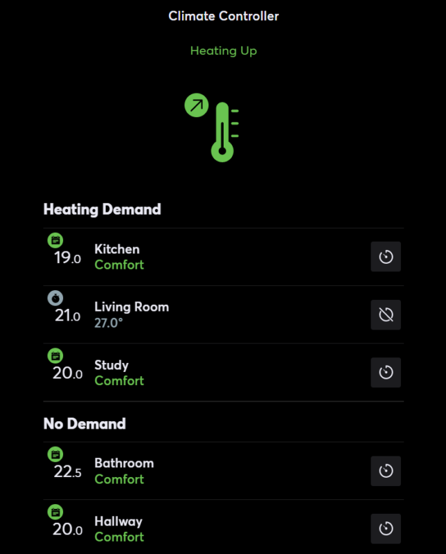 The Climate Controller then takes these values as well as the room size into consideration when determining the overall demand for heat in the building.