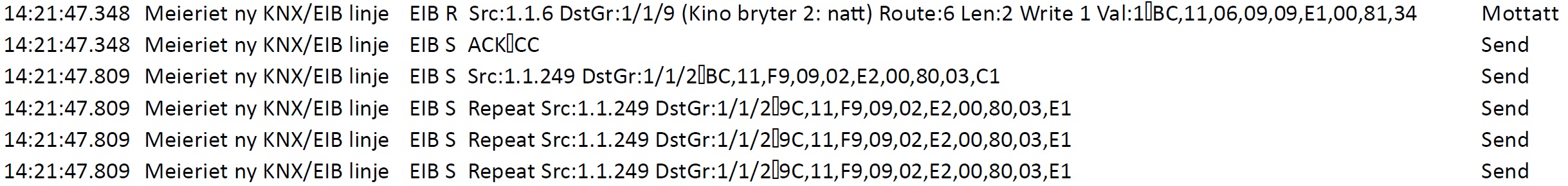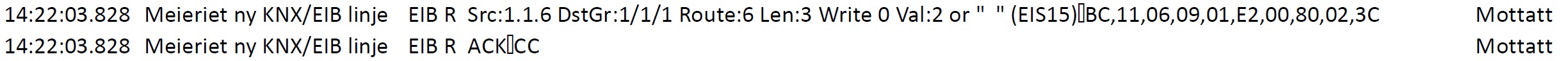 2: Second button on panel with adress 1.1.6 writes bit value 1 to group adress 1/1/9 which acts as input to Loxone. Loxone (adress 1.1.249) sends a telegram which appears to be empty, there is no payload displayed. This telegram is sent to group address 1/1/2 which is meant to activate a scene.