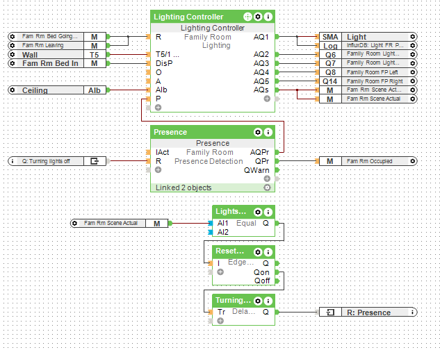 However, the Presence Sensor sometimes (but not always) remains active. And if it remains active, then motion won’t trigger the Presence function block and the lights won’t come on. It makes no difference whether I use a trigger based on the light mood or use the RQ output from the Lighting Controller.