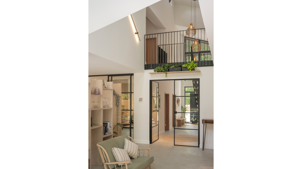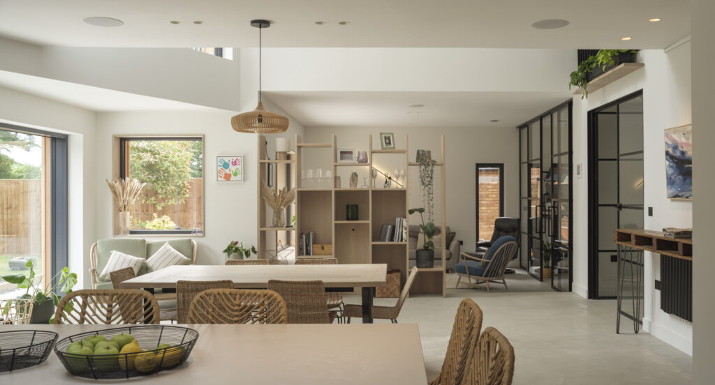 Passive stack ventilation and mechanical heat recovery manage ventilation, while heating and multiroom audio adapt to occupancy, creating a comfortable, modern family home.