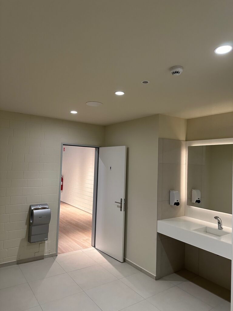 A total of 19 Presence Sensors are used to individually monitor the presence of the various hall sections. This means that, for example, a pickleball court can be switched from 10% standby lighting to 100% game lighting when there is presence. In the changing rooms, the mirrors are illuminated in such a way that even exhausted athletes look good. The showers and toilets are illuminated more brightly when there is presence and, because it was a good idea, the ventilation was also integrated via DALI. The well-earned beer after the exertion can be enjoyed in the pleasantly lit lounge area.