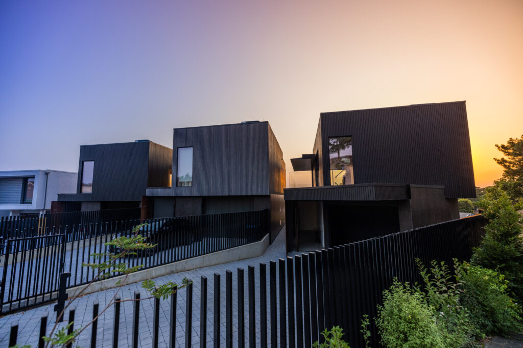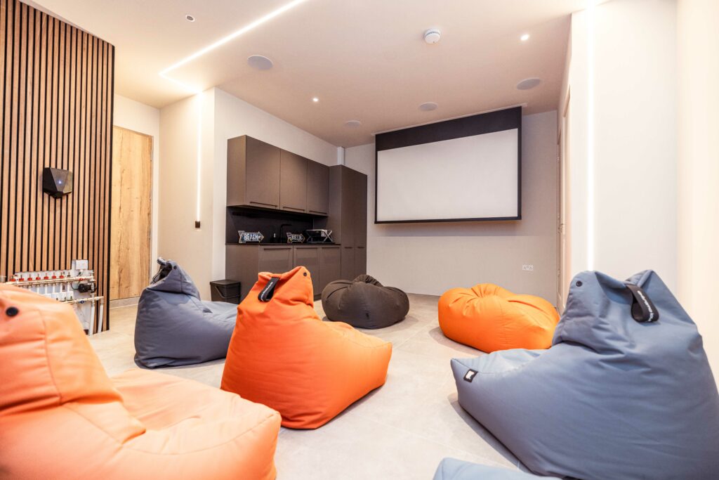 We installed discreet and high performing Loxone speakers in all rooms, resulting in a scalable multiroom audio solution throughout. One of the houses opted for surround sound in the garage, acting as an informal cinema room.
