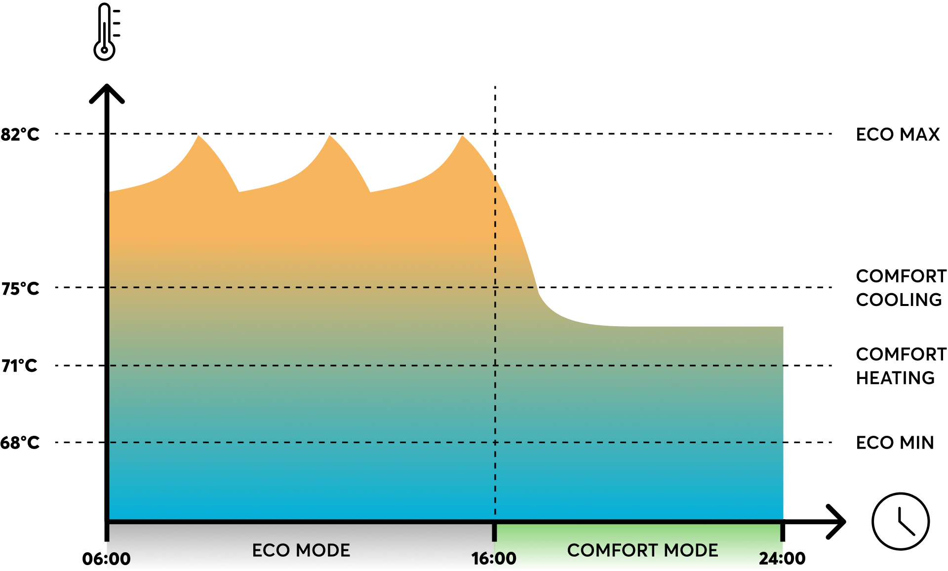 In order to use cooling or heating energy as cost efficiently as possible, a room can be “overcooled” or “overheated”. This function is ideal in combination with the energy manager for optimizing the self-consumption of a PV system or with the spot price optimizer.