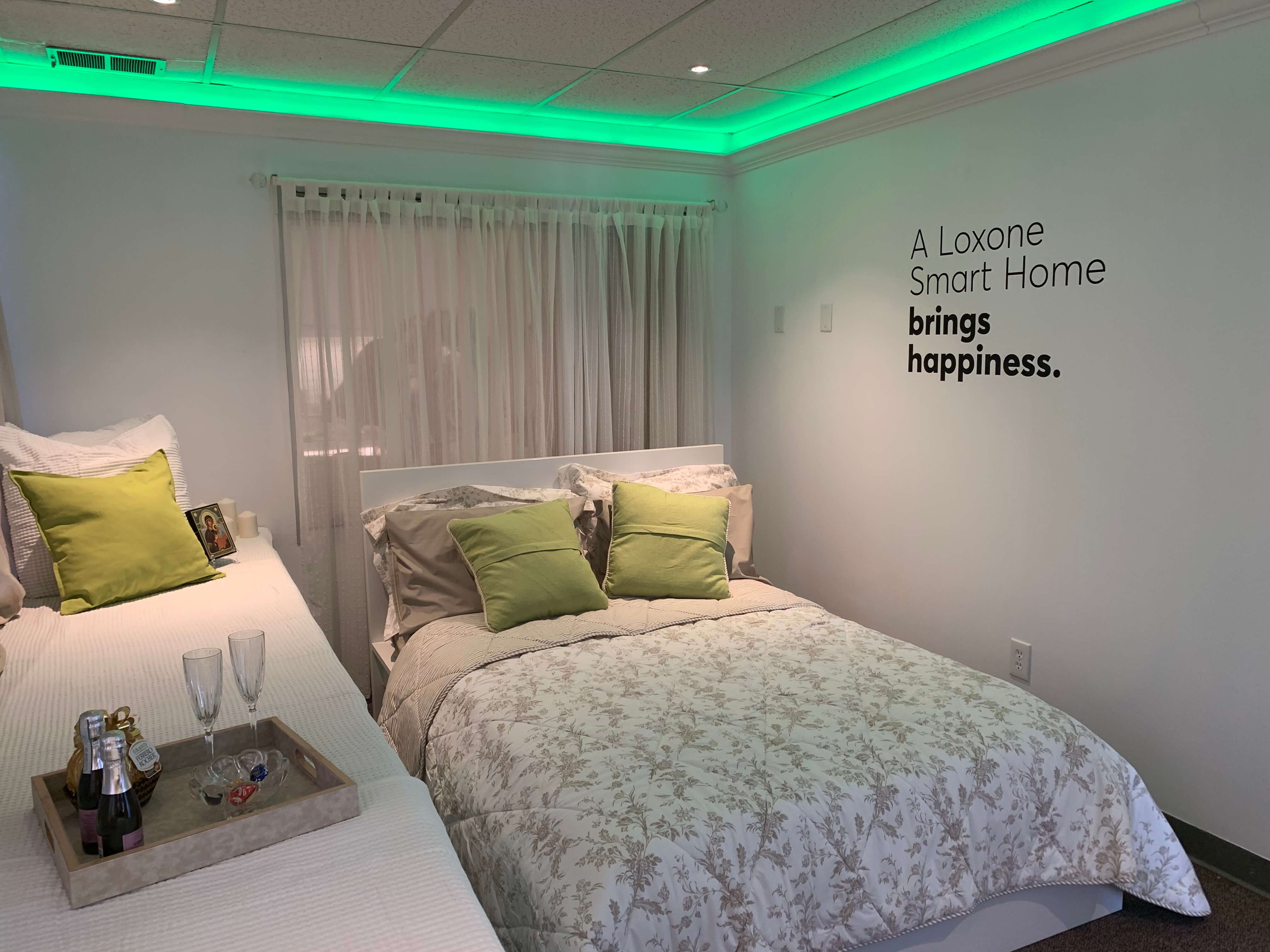 A favorite for bedrooms, LED Strip lighting runs alongside crown molding for dramatic effect with any colors you choose. Automated shades are used here that can help wake you up with natural light.