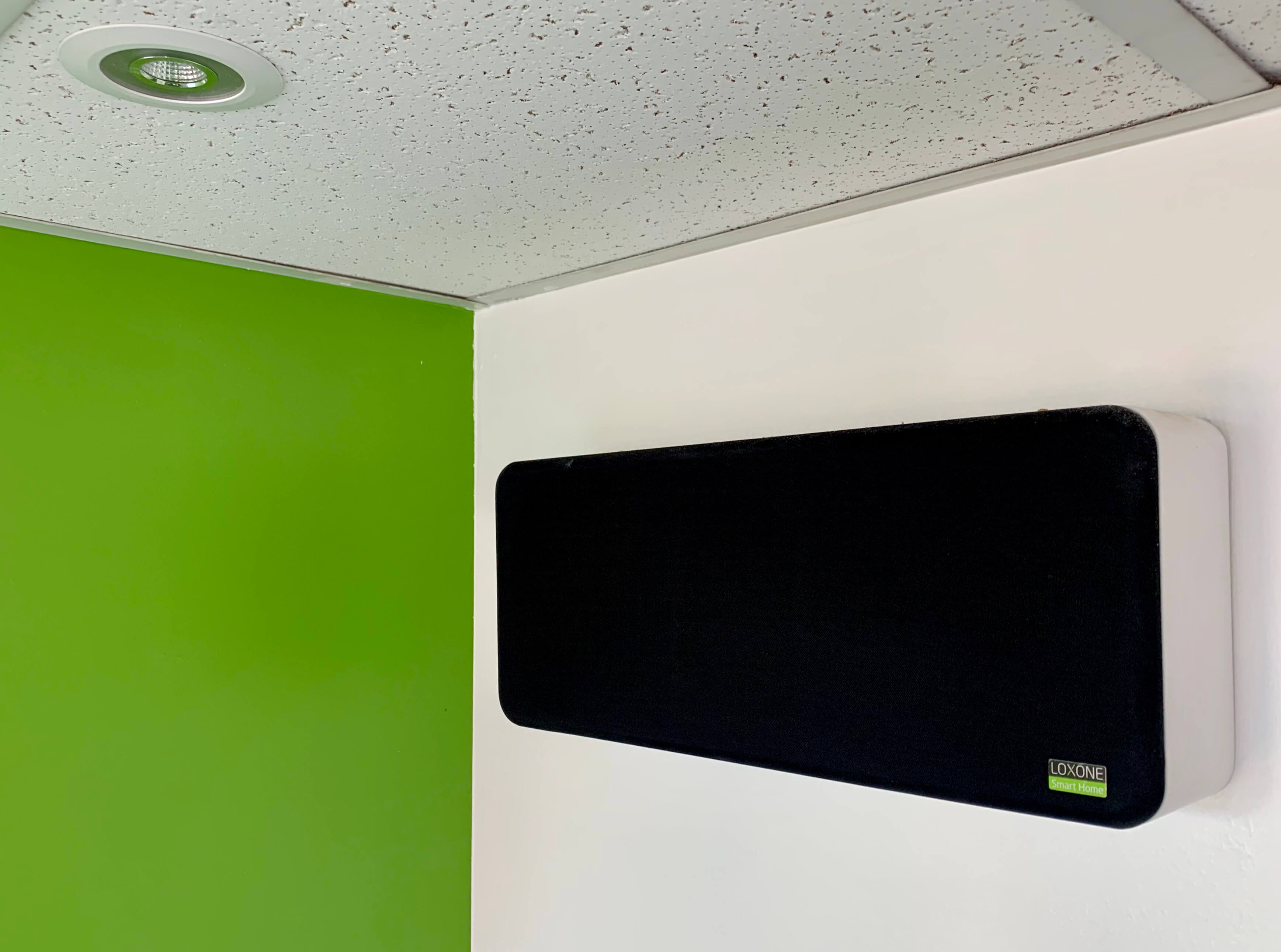 The perfect spot to show off the Touch Pure, the living room has a range of lighting moods – paired with audio from Loxone Wall Speakers – that you can adjust with just a tap. The room even has automated third-party shades, also at your control.