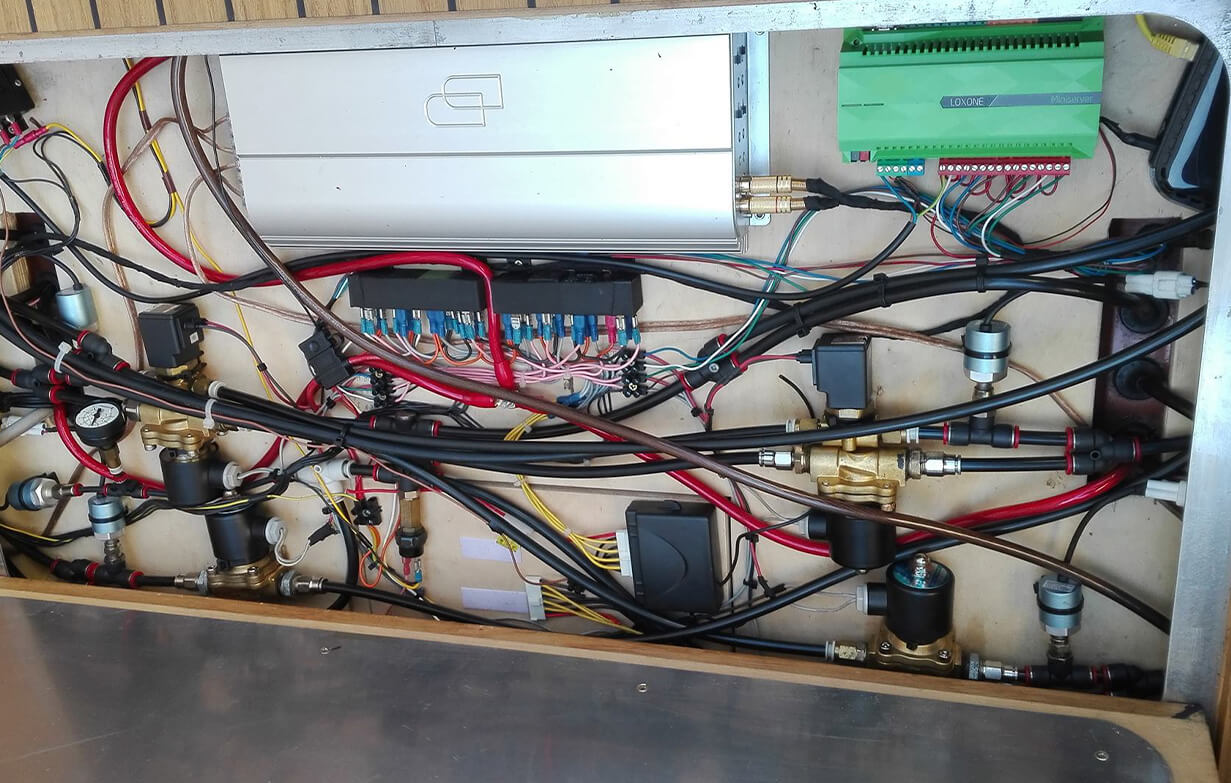 Car guys and gals know what an air ride is, but for those who don’t, an air ride is a system that is capable of lowering and raising a car by pumping compressed air into flexible bellows, creating a smooth and consistent quality ride. In this whip, the air ride is easily activated via the Loxone App.