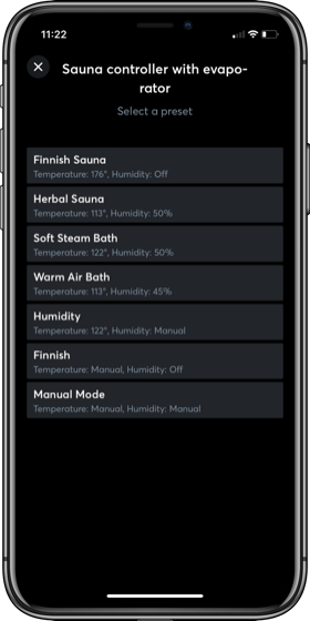 Operating Modes: If your customer has a sauna heater with an evaporator, different operating modes can be achieved using steam or dry heat such as Finnish, Herbal, Steam Sauna, Dry Sauna and more. You can set a range of Operating Modes for different sauna users with various comfort levels.