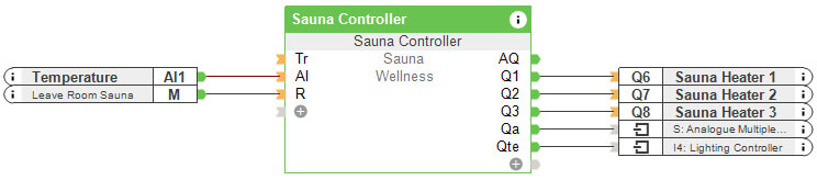 First in the Loxone Config, find the sauna control module. To control the sauna heater, connect the temperature sensor to the AI input and outputs to the sauna heater.