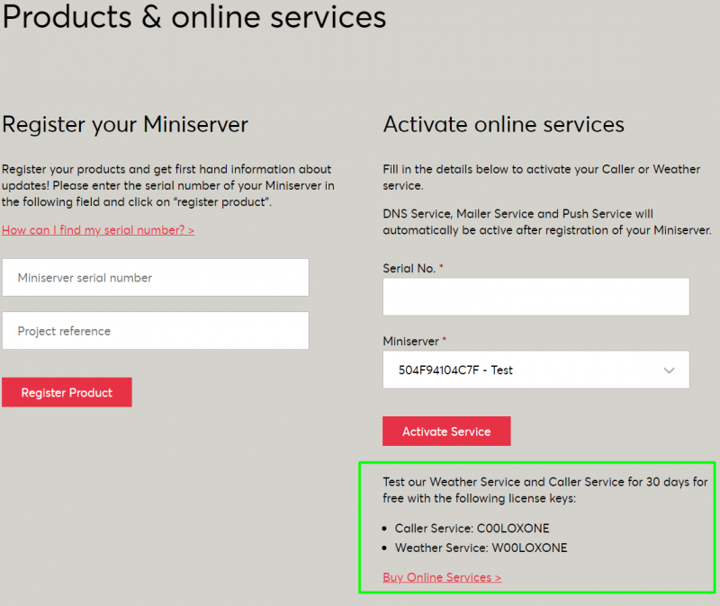 If you wish to use your Miniserver online you will need to connect it to a network that has an active internet connection. The easiest way to do this is take an ethernet cable plug one end into one of the ethernet ports on the router and the other end replaces the ethernet cable that is already plugged into the top left corner of the Miniserver. Once connected to the internet you must register your Miniserver at loxone.klyuchko.biz. This will allow you to use the DNS server for remote access and test the Weather Service and Caller Service for 30 Days free and without obligation. Check out the “My Products” section of your account on our website for the information on the Weather/Caller Service free trial.