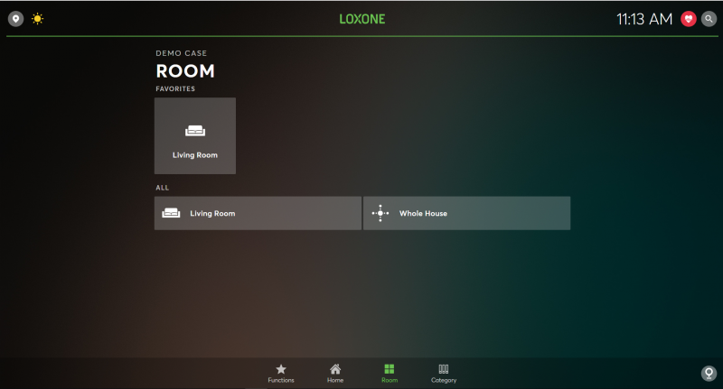 By tapping ‘ROOM’ at the bottom of the screen, you will see each individual room available to you on the screen. You will be able to view all available functions and features of that room after selecting it here.