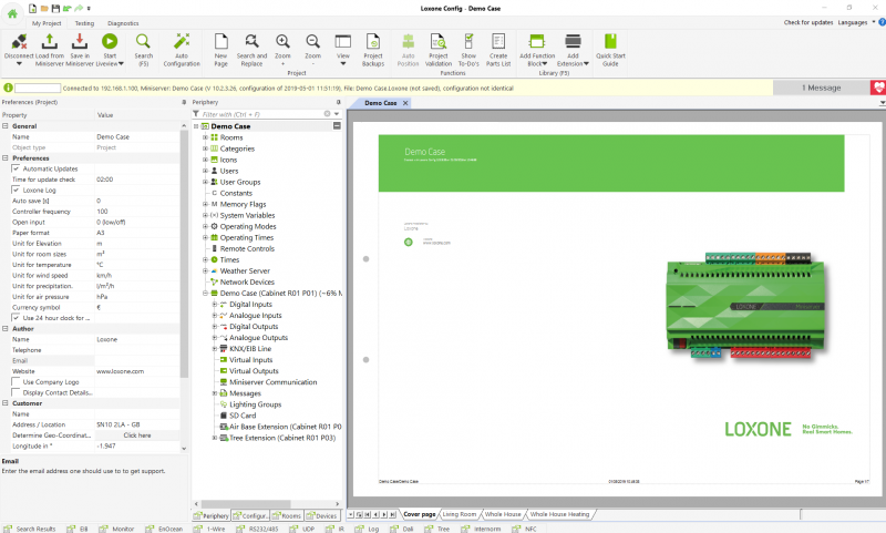 For further information on using Loxone Config have a look at our documentation pages “Auto Configuration” and “How to create logic in Loxone Config” Once you’ve tested your configuration, you can upload it onto your Demo Case Miniserver, by clicking ‘Save in Miniserver’ in the ribbon at the top.