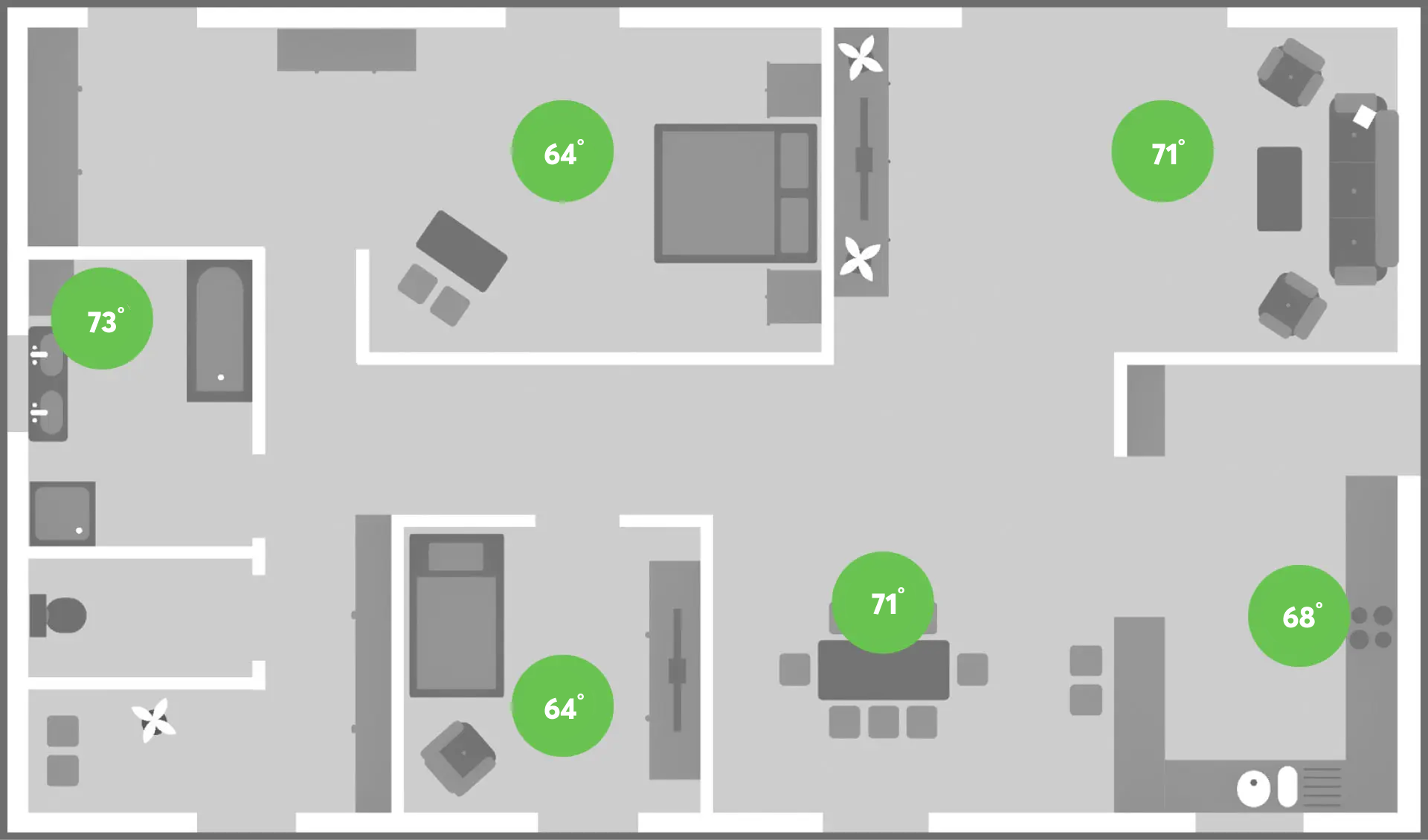The perfect indoor climate varies depending on use and individual preferences. It is therefore important to adjust it for each room. This ranges from a pleasant 64°F in the bedroom, to a concentration-enhancing 68°F in the office, to a comfortably warm 73°F in the bathroom. Thanks to individual room control, you can enjoy the perfect temperature everywhere – without the need for manual control.